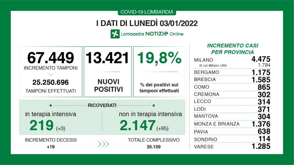 Sono 13,421 i nuovi positivi al coronavirus registrati in Lombardia a fronte di oltre 67 mila tamponi processati. Il tasso di positività si attesta al 19,8%. Si registrano purtroppo 19 decessi. Per quanto riguarda i ricoveri sono +3 in terapia intensiva e +95 negli altri reparti.