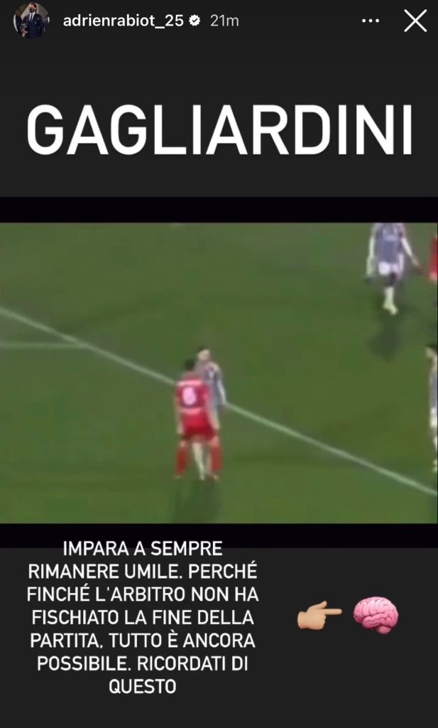 Attraverso una storia su Instagram, il calciatore della Juventus Adrien Rabiot ha voluto mandare un messaggio al centrocampista del Monza Gagliardini, senza troppi giri di parole: “Impara sempre a rimanere umile, perchè finchè l’arbitro non ha fischiato la fine della partita, tutto è ancora possibile. Ricordati di questo” usando anche l’emoticon del cervello.
