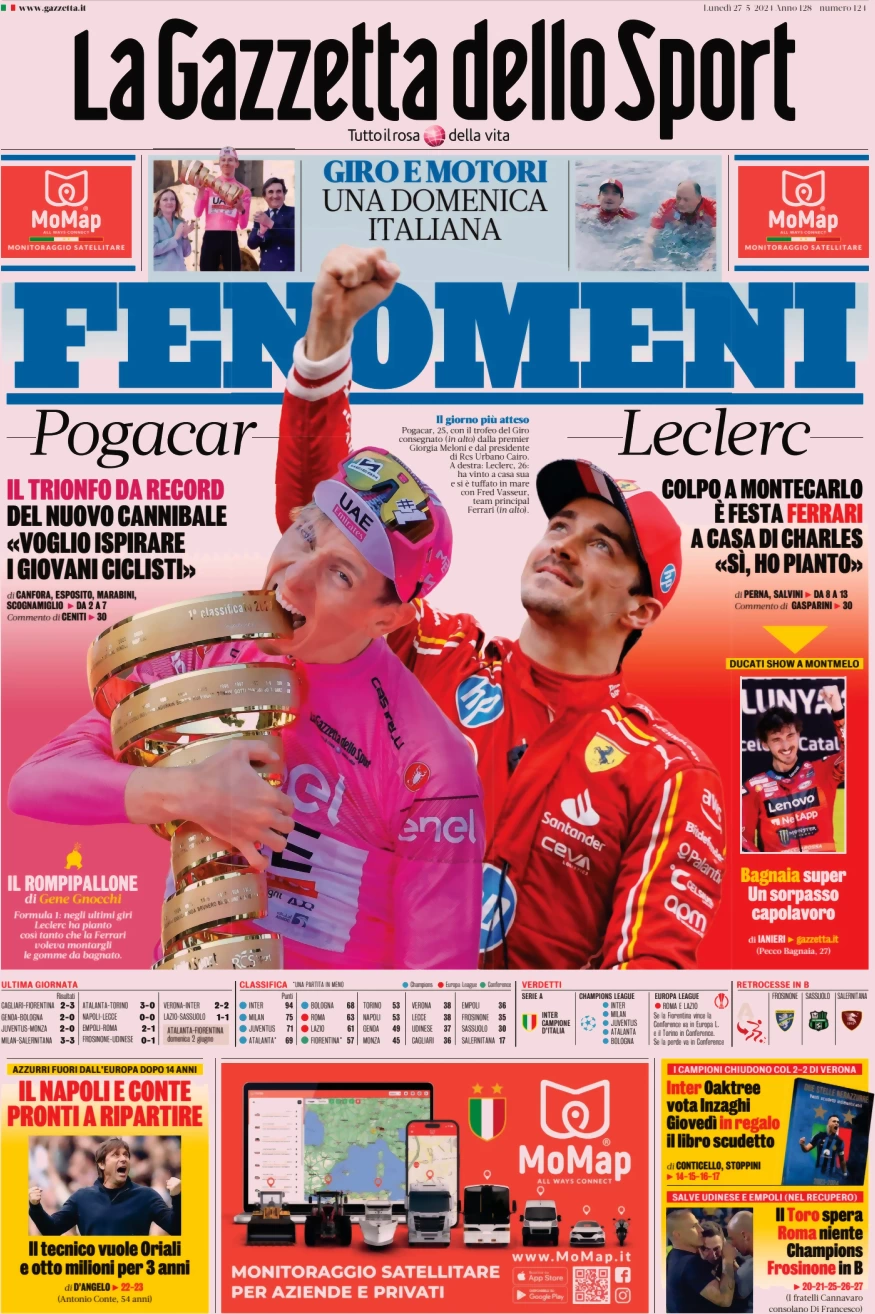 Vi proponiamo le prime pagine dei quotidiani sportivi di oggi in edicola, domenica 26 maggio 2024