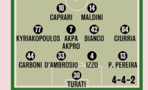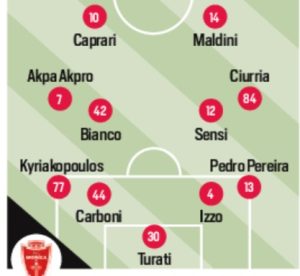 Turati; D’Ambrosio, Izzo, Carboni, Kyriakopoulos; Pereira, Akpa Akpro, Bianco, Ciurria; Caprari; Maldini